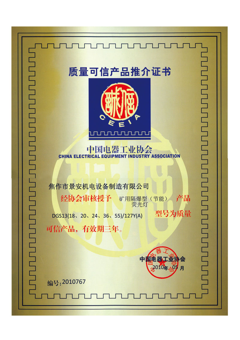推介证书-荧光灯