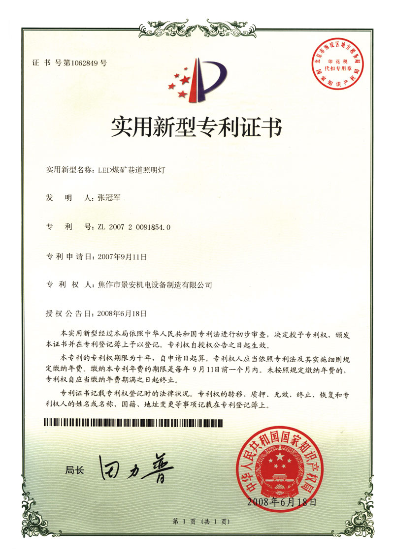 LED煤矿巷道照明灯专利证书1