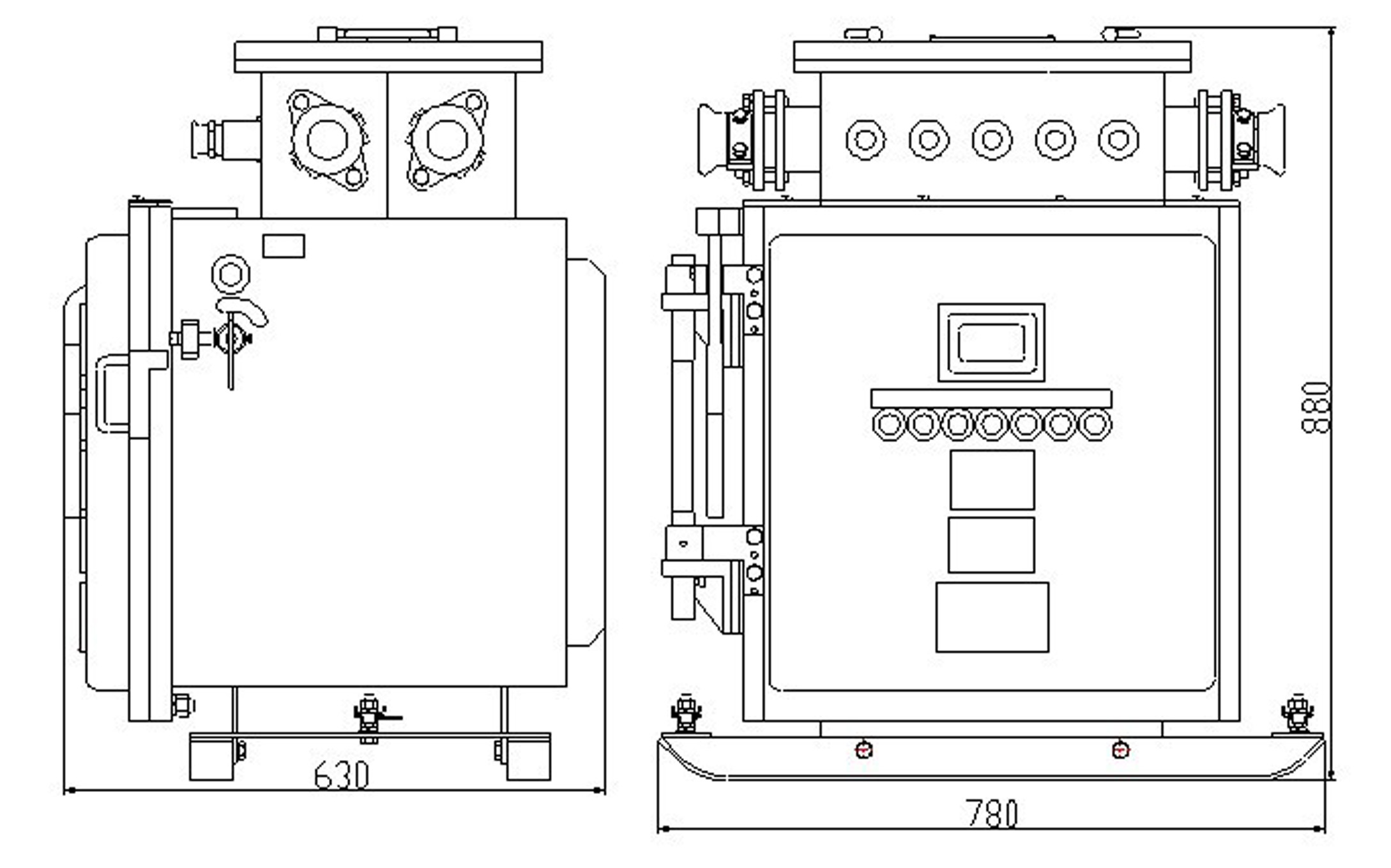 综合装置由隔爆外壳、主变压器和控制部分等组成。隔爆外壳为方形,壳盖与壳身采用滑动止口结构,开启方便。外壳上部的接线箱作为引进和引出电缆用,外壳右侧装有操作组合开关的手柄,并有可靠的机械联锁装置,门盖上装有控制按钮和试验按钮,门盖上有一观察窗,可以从外面观察到装置里面液晶汉显显示屏的指示状态。壳体内的控制部分由控制器件板和真空交流接触器板组成。在控制器件板上装有微电脑控制器、液晶显示屏、电流取样板、电流传感器、滤波器、电源控制变压器、试验电阻、保险等器件。真空交流接触器板上装有真空交流接触器、管式熔断器,电流互感器,三相电抗器等器件。控制器件板与真空交流接触器板通过一组航空插件及连线构成联系。防爆外壳箱体内装有主变压器。